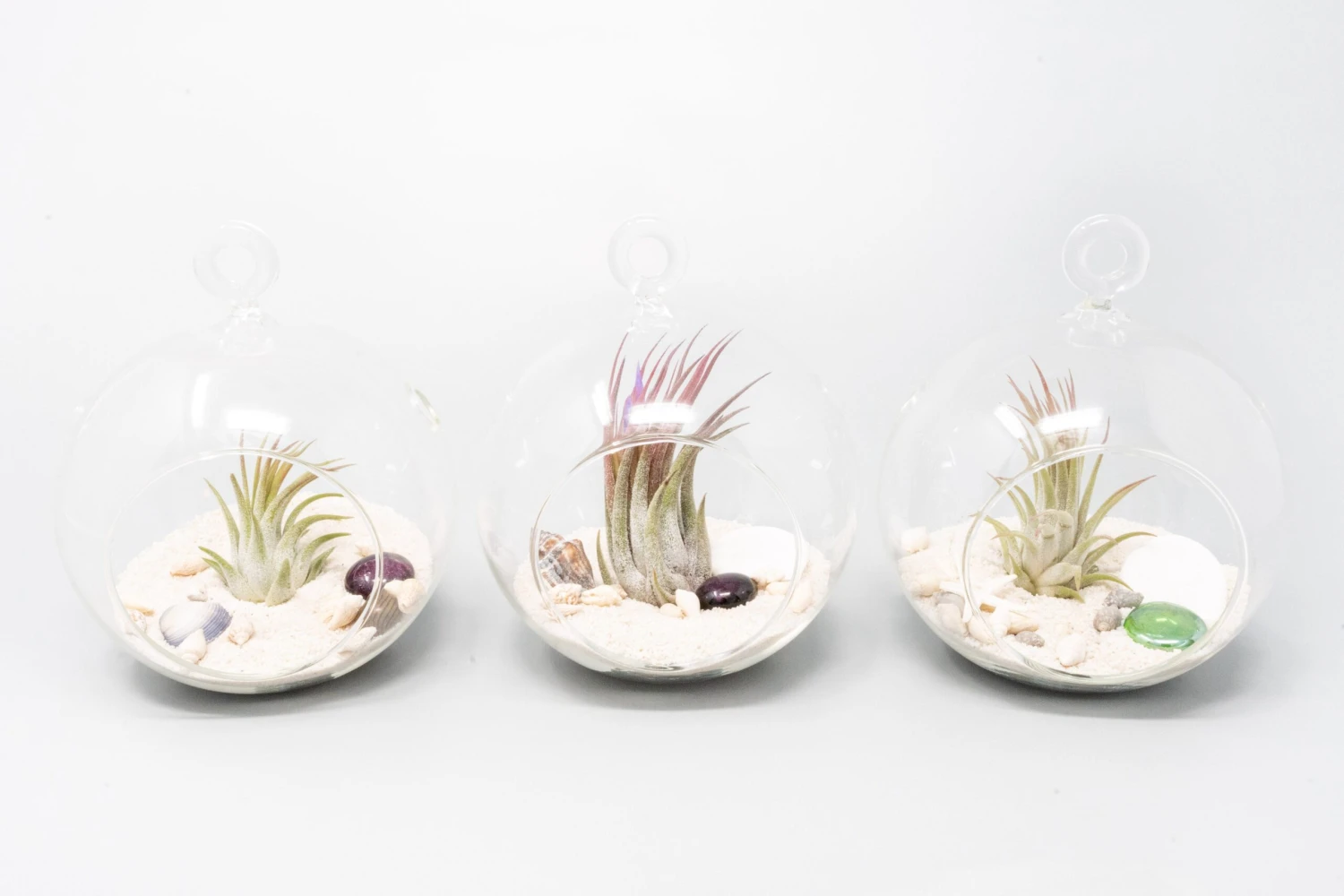 Here is a cute beach-themed terrarium in a glass globe. Includes white sand, various sea life, glass bead, and ionantha.