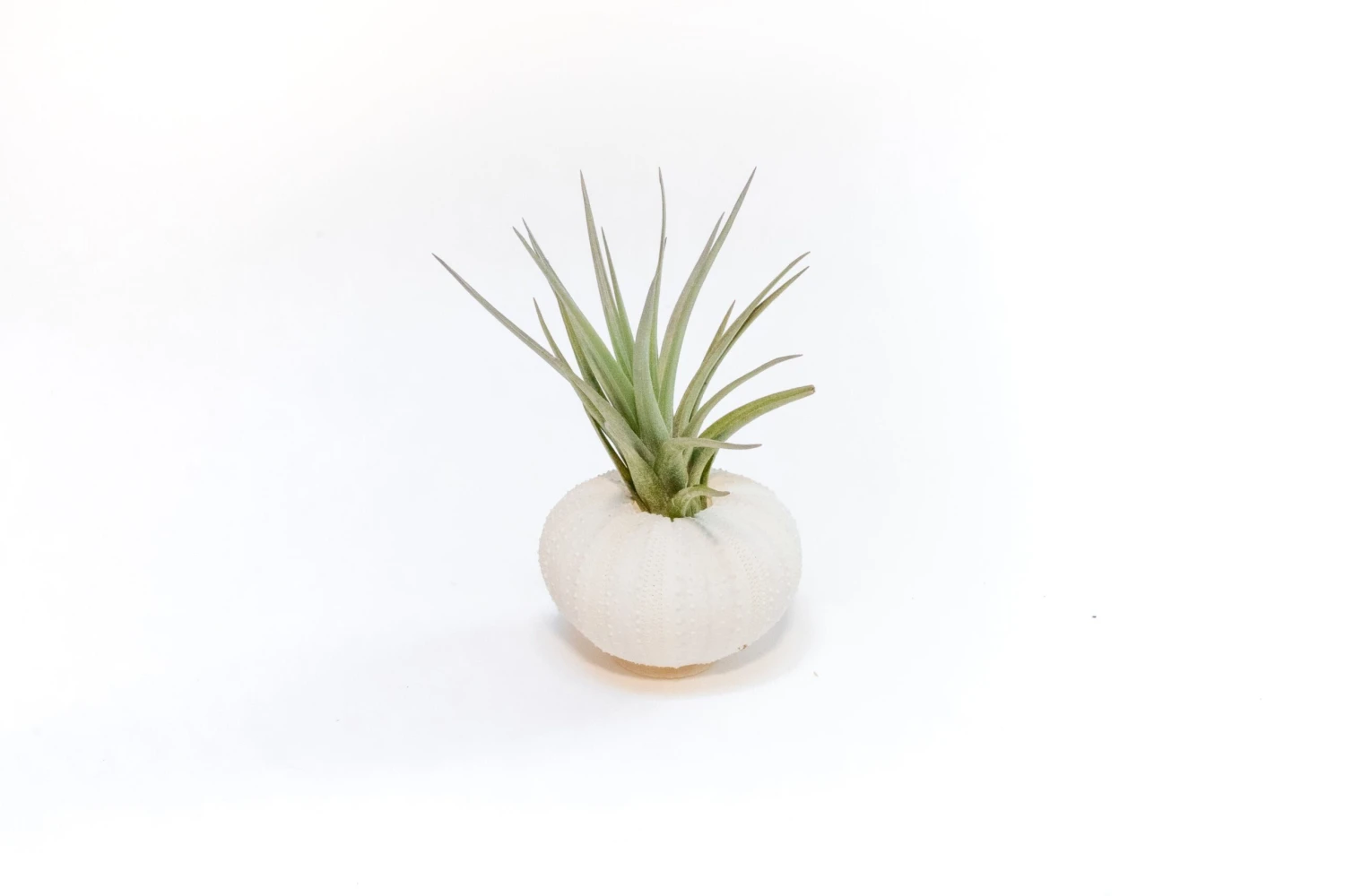 The Pink, Purple, White, and Green Urchin shells measure about 1.5 to 2 inches wide and 1 inch tall. The Ionantha air plants are about 1.5 inches tall. No glue or filler needed. The air plants fit perfectly in these cute little shells and are about 2 inches tall. A mix of urchins will be sent and the variety depends on availability at the time of purchase.