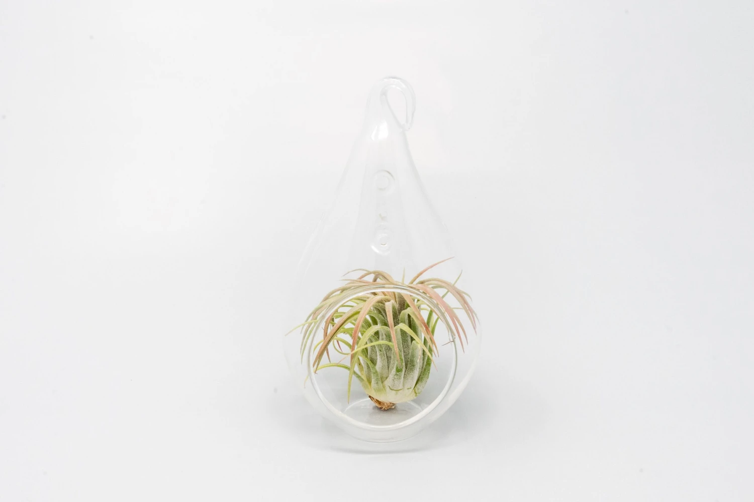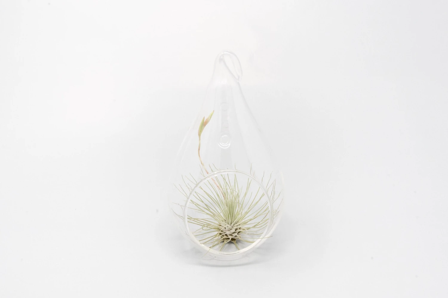 A simple teardrop terrarium with your choice of air plant. Admire the plant’s unique form from all angles of the glass. No dirt required. They have a hook for hanging or you can place them on their flat bottom.