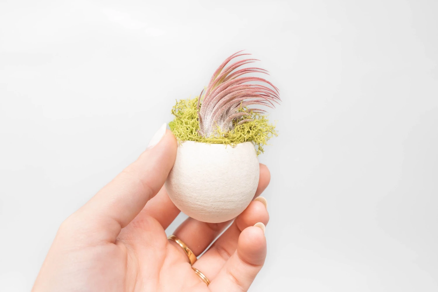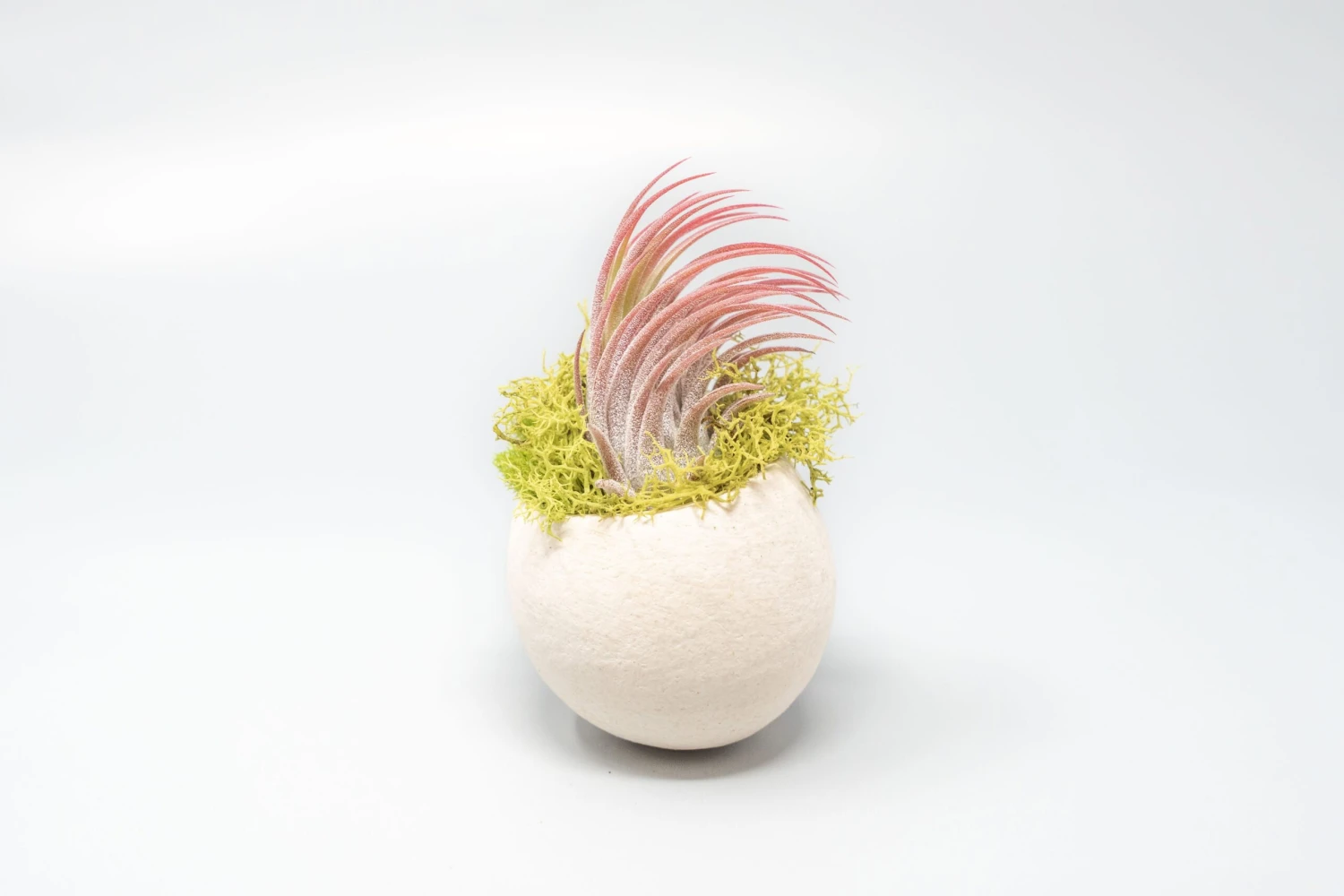 Statement pieces can come in small packages! Enjoyย your new adorableย Ionantha air plant held in a beige-colored seed pod. A pinch of preserved chartreuse reindeer moss is included. Opening up this gorgeous air plant will brighten anyone’s day.ย This easy-to-care-for arrangement is perfect for offices, kitchens, side tables, or party decor.
