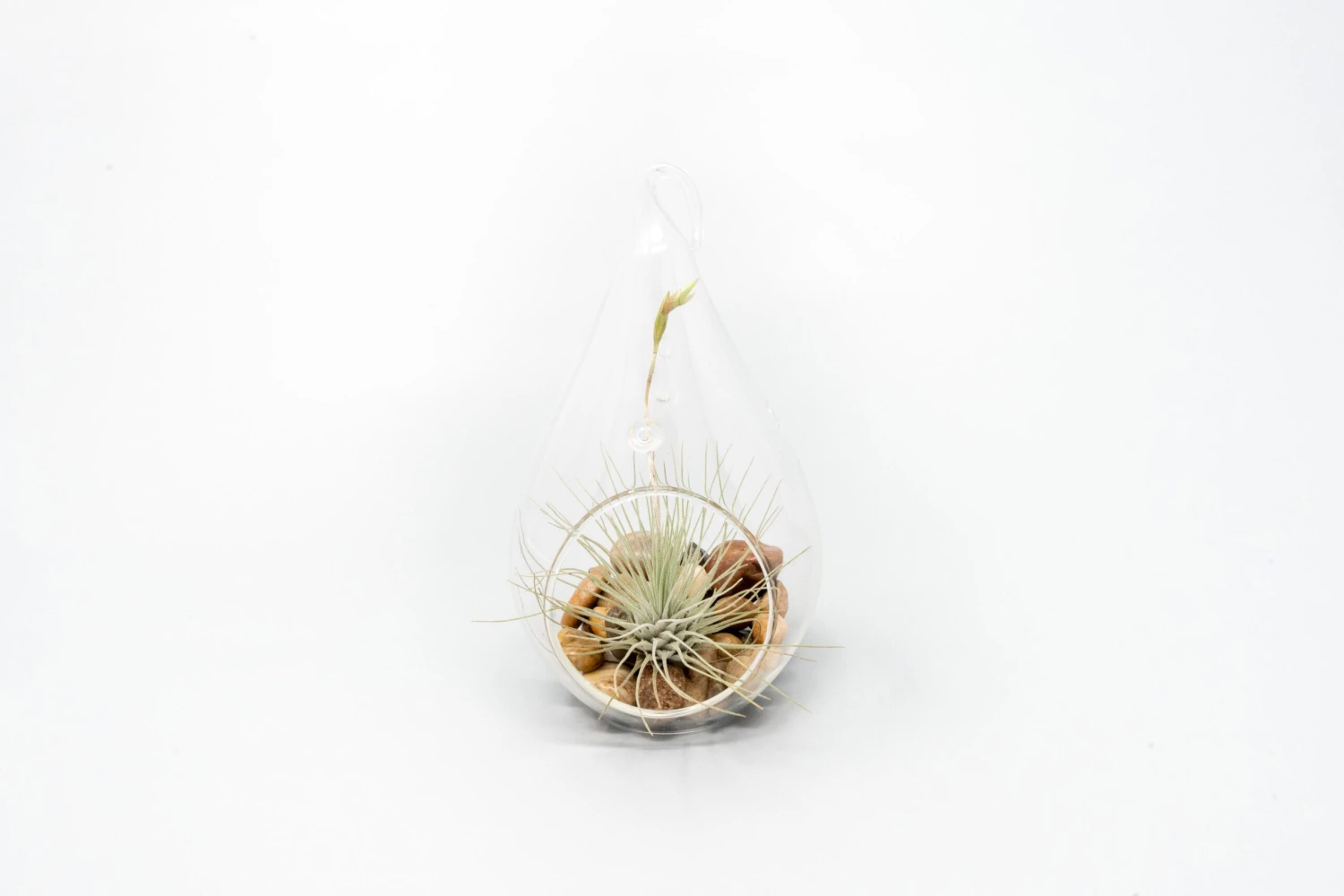 Showcase exotic Argentea Thin (Right), Abdita (Middle), and Ionantha Guatemala (Left) air plants in hand-blown glass teardrop-shaped terrariums complete with smooth river stones. Artistically hung in groups of three, or placed on a table with their flat bottoms, these arrangements will add a gorgeous touch of nature to the indoors.