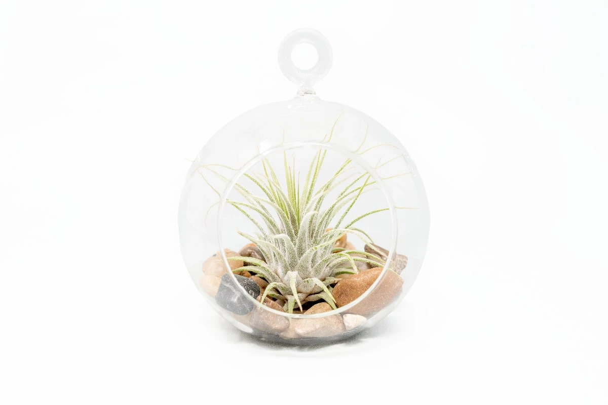 One of our most popular terrariums. Includes glass globe, air plant and river stones. The glass globe can be hung or set on its flat bottom.